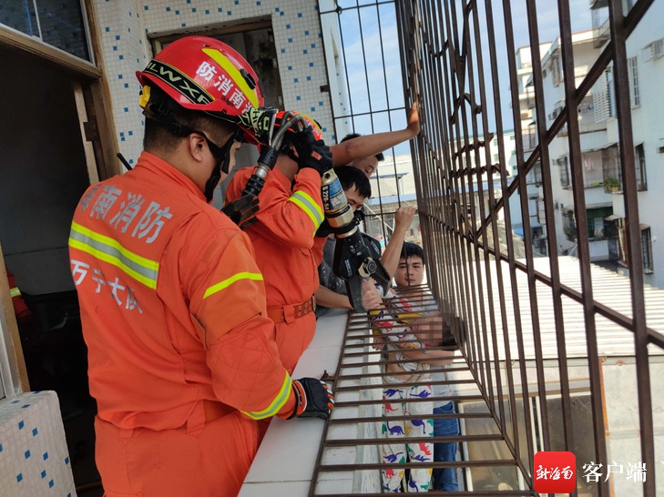 1月24日15时48分,万宁消防救援大队指挥中心接到群众报警,位于万宁市万城镇红砖中路小青电器城附近居民家3楼,有一名男孩被困在防盗窗口需要救援。接到报警后立即调派万城站1辆消防车6名指战员赶赴现场进行处置。