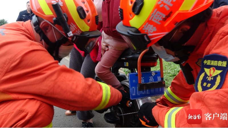 临高县消防救援大队指挥中心接到转警后,紧急调派临城消防救援站出动消防救援人员赶赴现场处置。消防救援人员到达现场后发现,一名3岁小女孩左脚卡在电瓶车后轮与减震之间的缝隙中,无法移动。