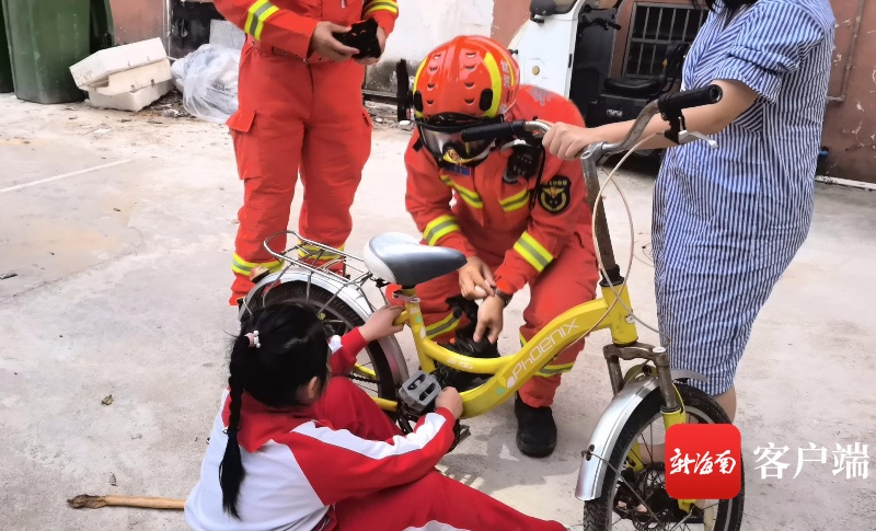18时50分,消防救援人员赶到现场,经询问,小女孩在自行修理自行车过程中,不小心被自行车链条卡住手指。消防救援人员根据现场情况,首先对小女孩进行安抚,并用手挡住女孩视线,然后利用断电剪迅速剪断自行车链条,成功将小女孩的手指从自行车链条中取出。